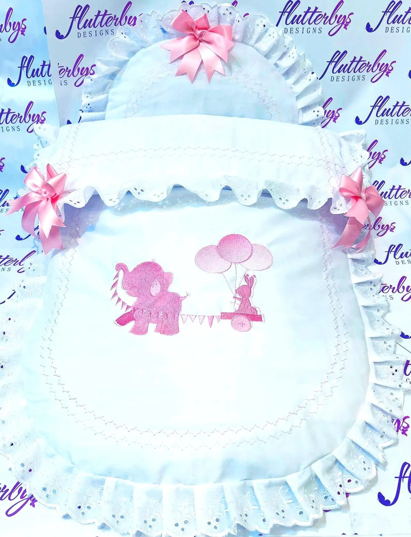 Baby Pram Quilt & Pillow Set to fit, Any pram White fabric and Shades of Pink embroidered Elephant design. Perfect Gift