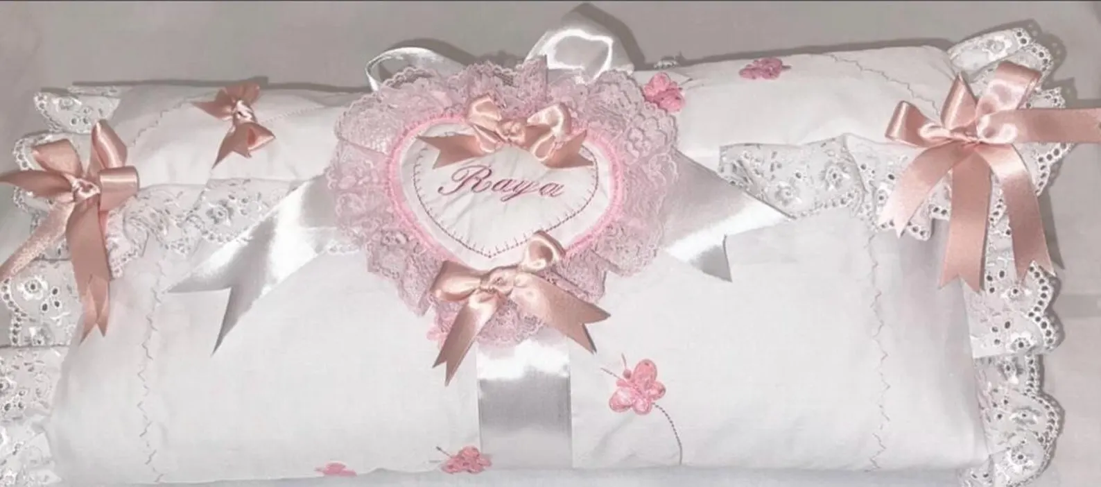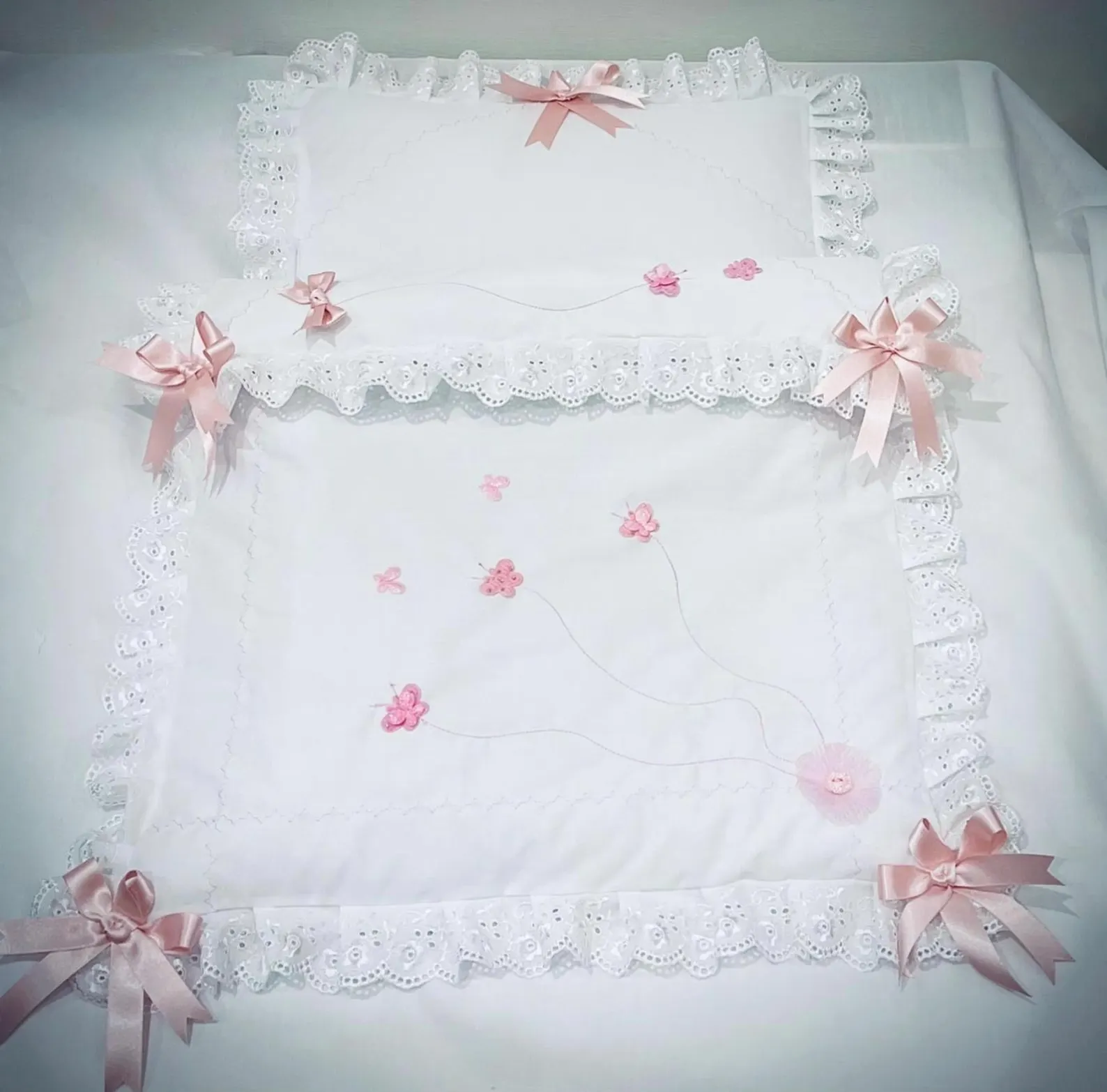 Crisp White Poly cotton fabric with pretty Pink stitch detail, embellished with pretty butterflies and flower motif's trimmed with broderie anglaise lace and finished with double satin ribbon bows.