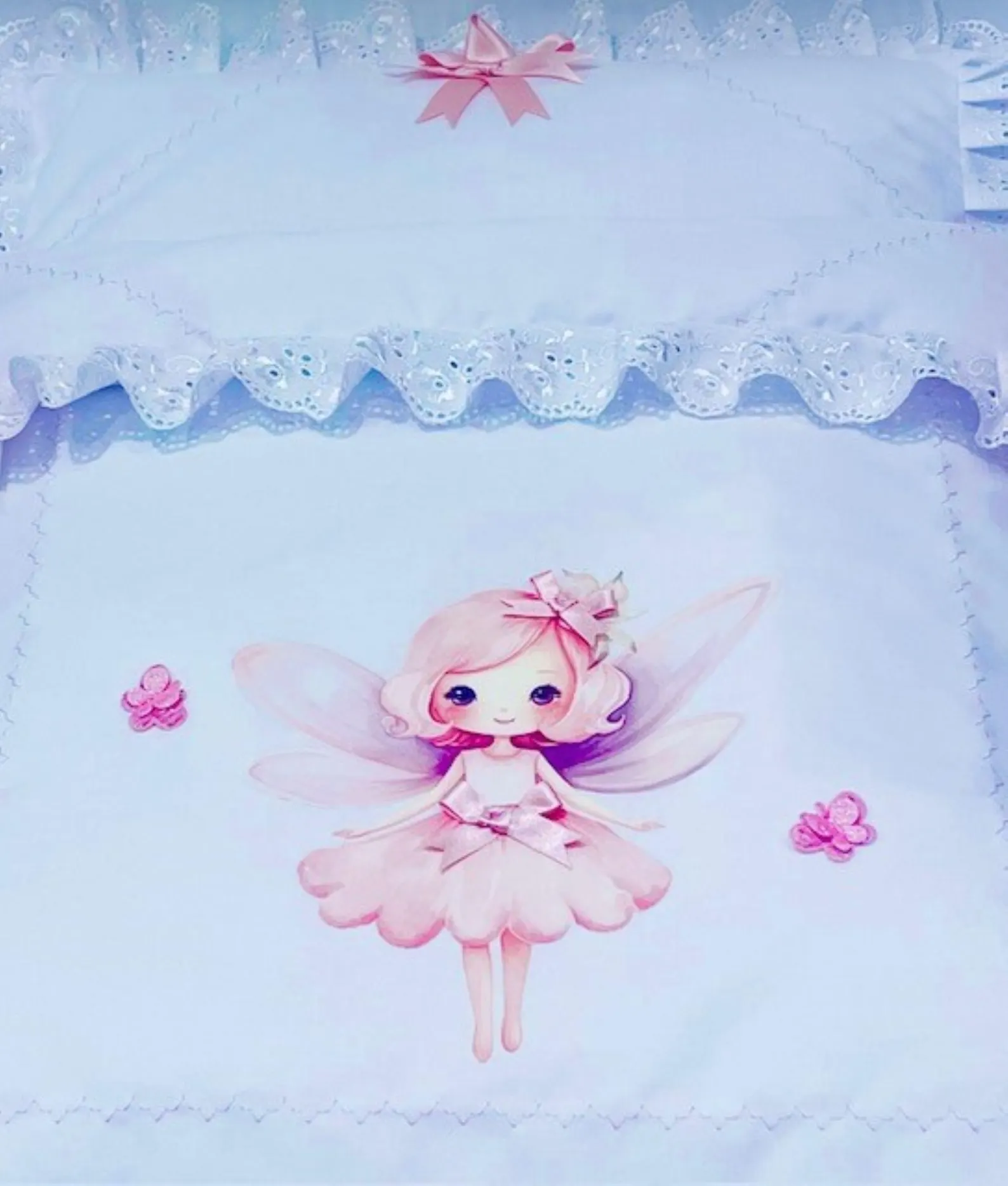 Crisp White Poly cotton fabric with pretty Pink Fairy on a swing detail, embellished with pretty butterflies and flower motif's trimmed with broderie anglaise lace and finished with double satin ribbon bows.