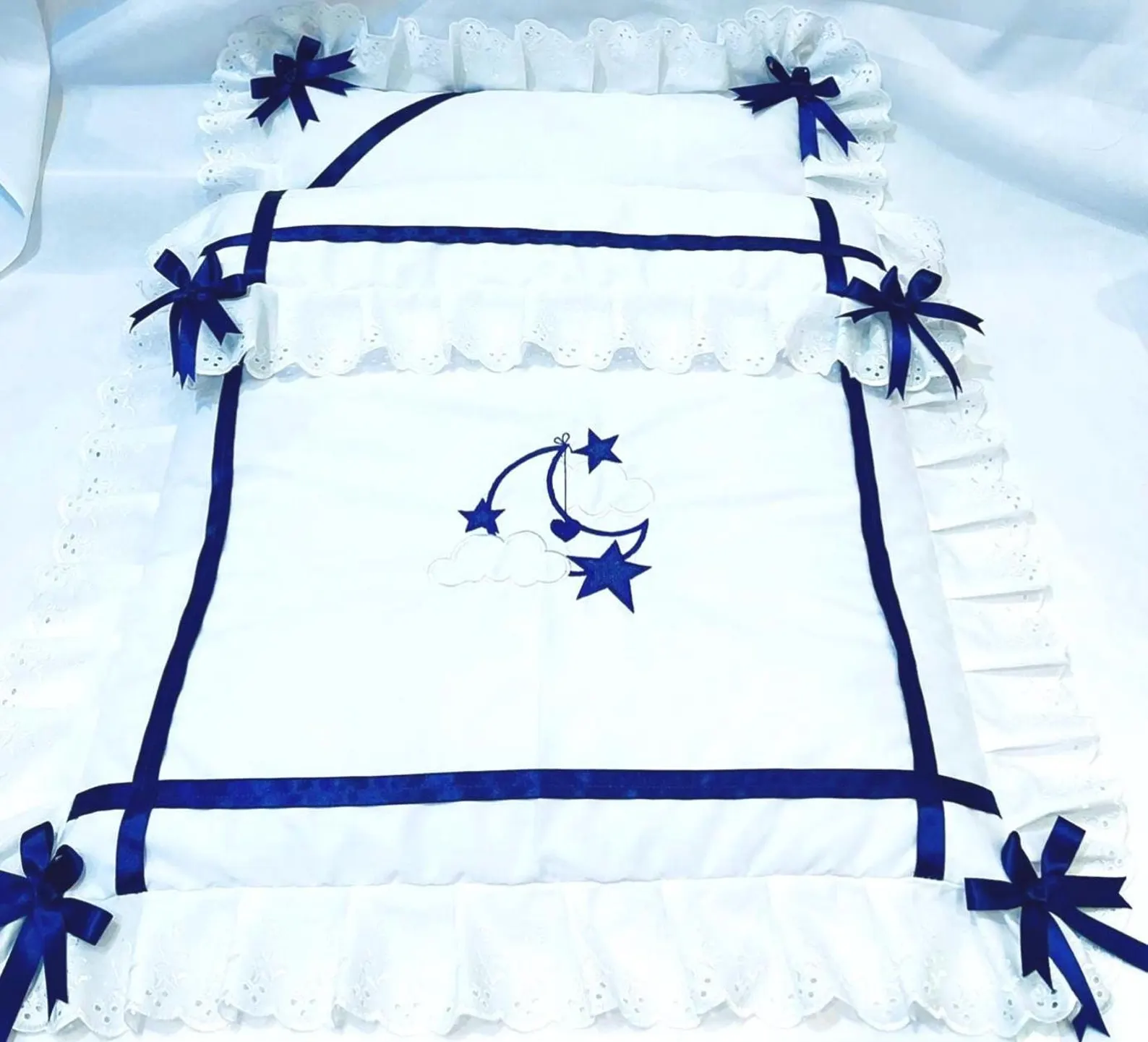 Beautiful exclusive design Pram Quilt set Trimmed with broderie anglaise lace frill and finished with double satin ribbon bows. Embroidered Moon and Stars design. perfect gift. This set is trimmed with double satin ribbon .. available in any colour to fit any pram .. round edge quilts available for modern style prams/travel system ..
