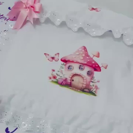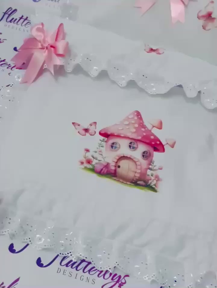 Crisp White Poly cotton fabric with pretty Pink stitch detail, embellished with pretty butterflies and flower motif's with Fairy Toadstool Cottage trimmed with broderie anglaise lace and finished with double satin ribbon bows.