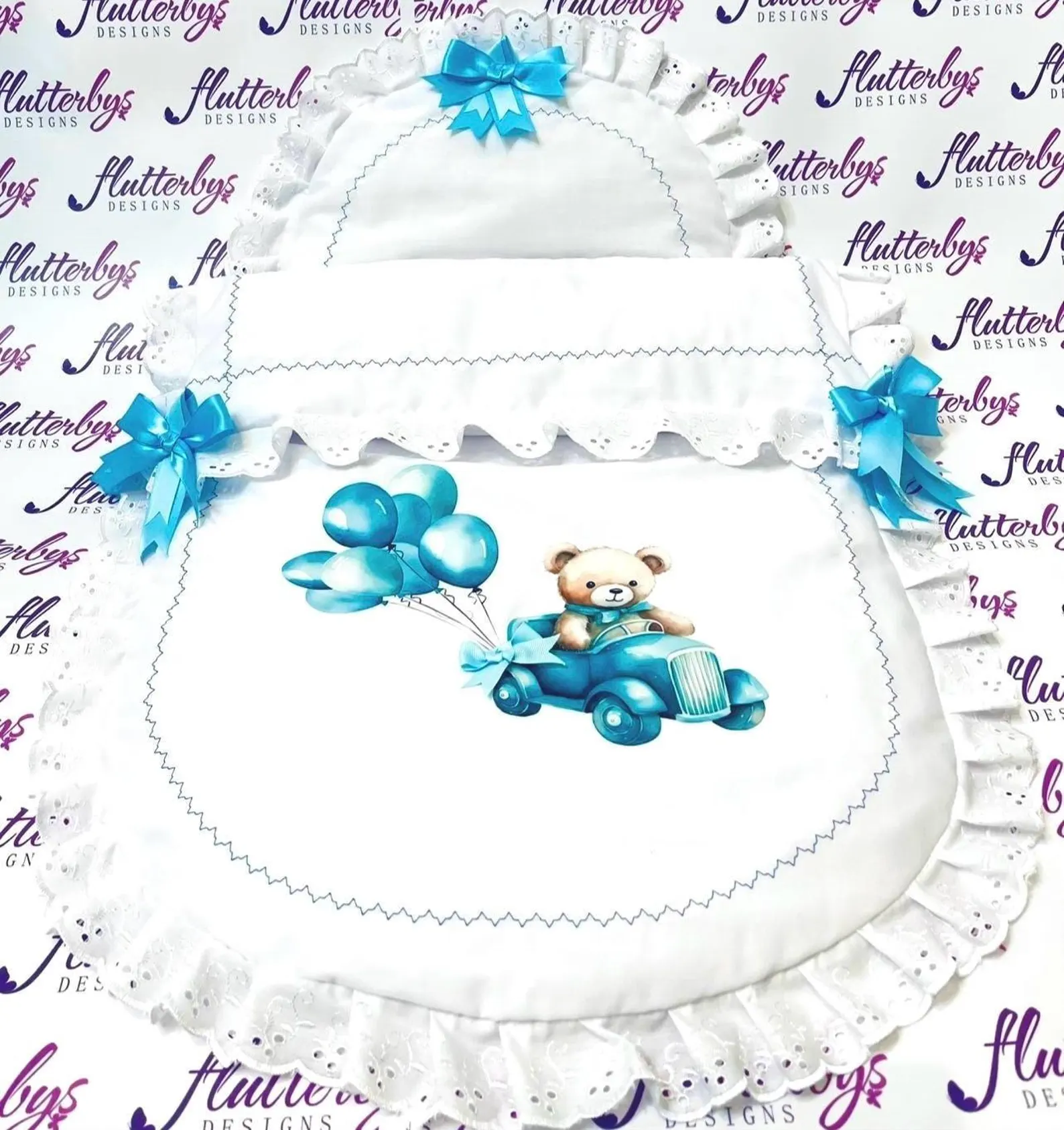 Pram Quilt White with Blue Teddy Car made to fit any pram Perfect gift