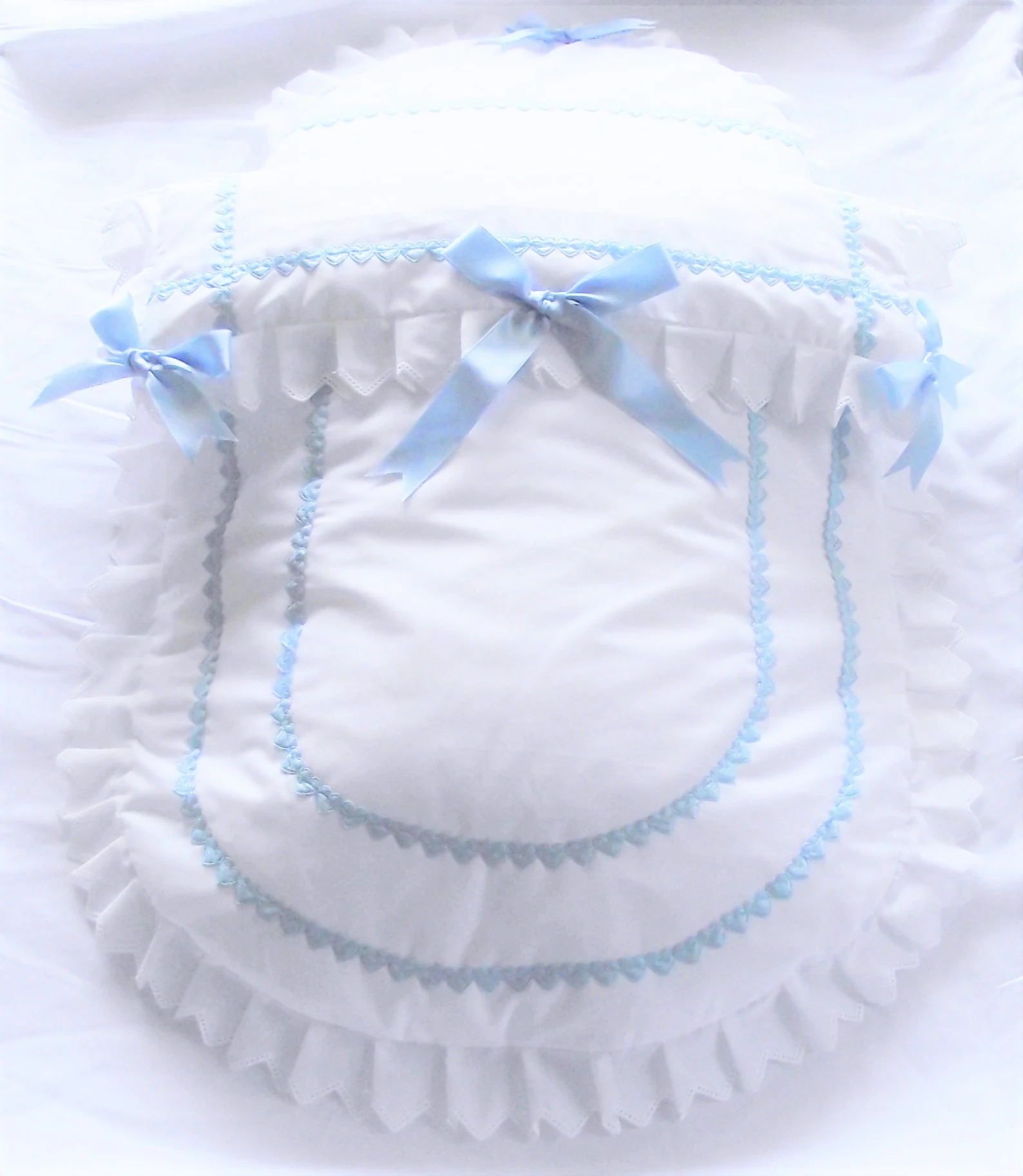 Pram quilt cover and pillow case, inner quilt and pillow pad covered with poly cotton easily removed for washing.
