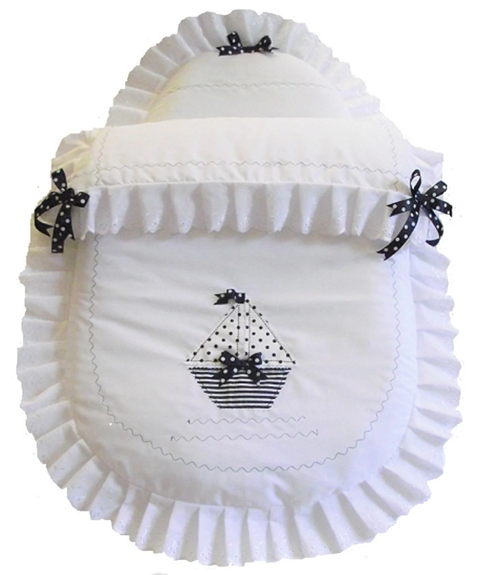 White poly cotton fabric with Navy and White Polka dot and stripe sail ship appliqué motif. Trimmed with broderie anglaise lace frill. Finished with Satin ribbon trim ribbon.